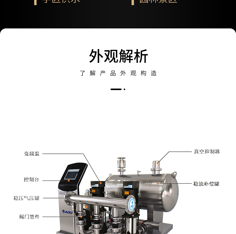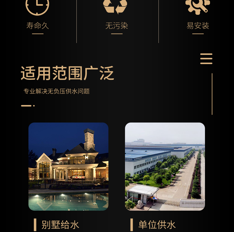 ALCW智能型無(wú)負(fù)壓供水設(shè)備是以市政管網(wǎng)為水源,充分利用了市政管網(wǎng)原有的壓力,形成密閉的連續(xù)接力增壓供水方式,節(jié)能效果好,沒(méi)有水質(zhì)的二次污染,是變頻恒壓供水設(shè)備的發(fā)展與延伸。適用于任何壓力不足的區(qū)域;住宅小區(qū)、寫字樓、商場(chǎng)、學(xué)校、部隊(duì)、工廠、浴池、景區(qū)、政府辦公樓、老舊泵房改造等;工礦企業(yè)的生產(chǎn)生活用水,各種循環(huán)用水系統(tǒng)。