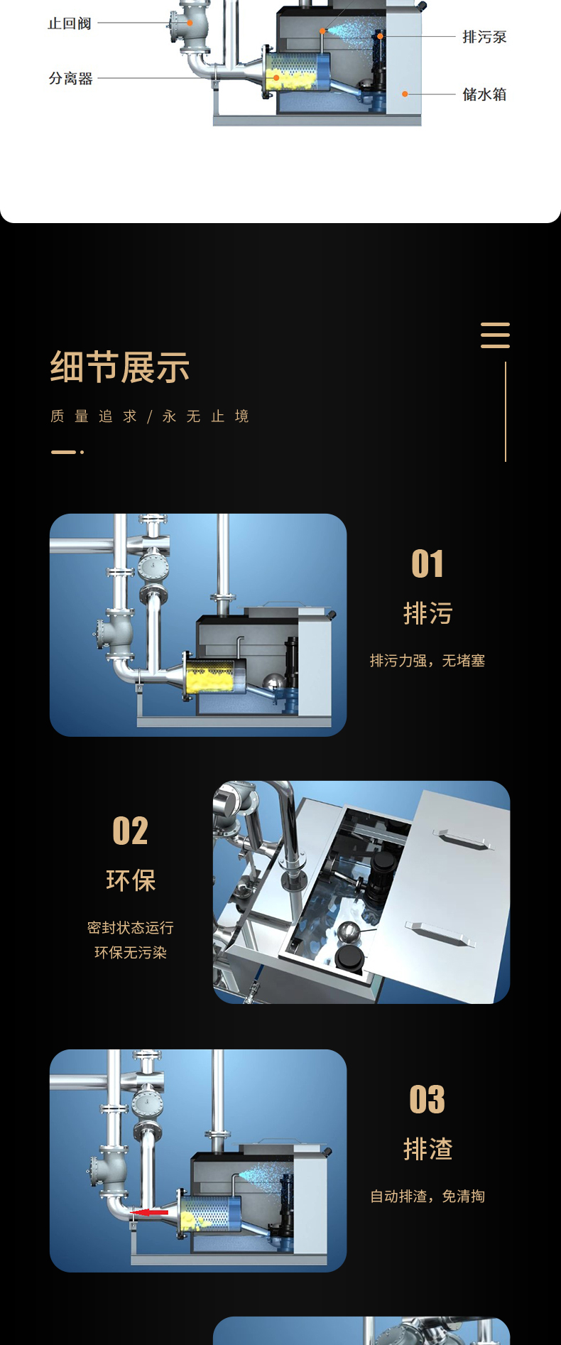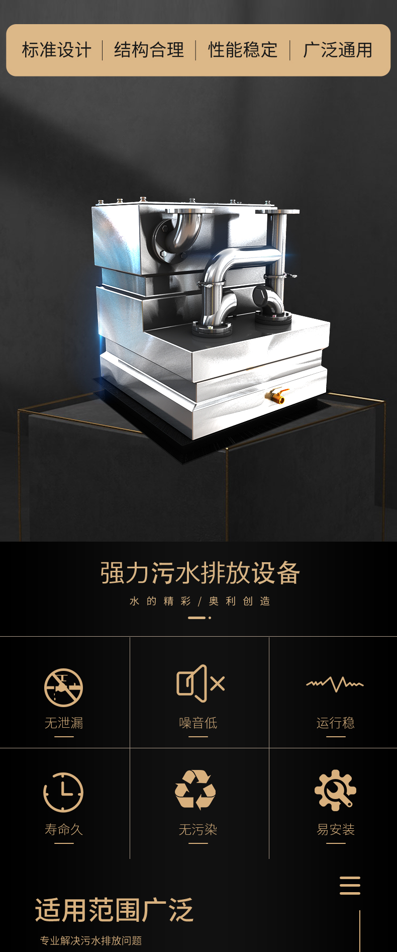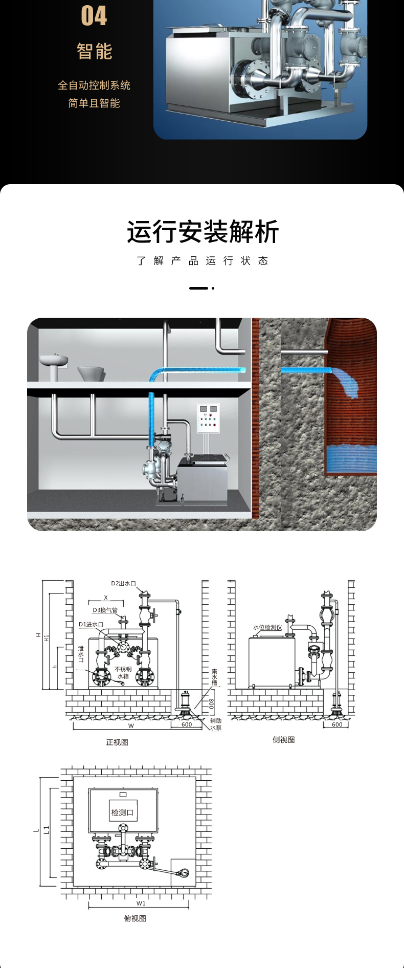 ALPW型污水強(qiáng)力排放設(shè)備,是我公司技術(shù)研發(fā)人員結(jié)合現(xiàn)場實際使用情況,以經(jīng)濟(jì)實用、環(huán)保高效為核心自主開發(fā)的新一代產(chǎn)品。它的特點是利用設(shè)備過濾功能將污水中的雜質(zhì)和固體顆粒巧妙的擋在雜質(zhì)沉積腔里,當(dāng)集水箱內(nèi)水位達(dá)到設(shè)定啟泵水位時,污水泵啟動將箱內(nèi)集水與沉積腔內(nèi)的雜質(zhì)一起排至室外排水檢查井里,當(dāng)集水箱內(nèi)水位達(dá)到停泵水位時,污水泵停止完成了一次污水排放,每排放一次,就對沉積腔內(nèi)的雜質(zhì)清理一次,既避免了雜物的沉積節(jié)省了人工定時清理;又使雜質(zhì)不通過污水泵,避免水泵卡死造成的損壞。