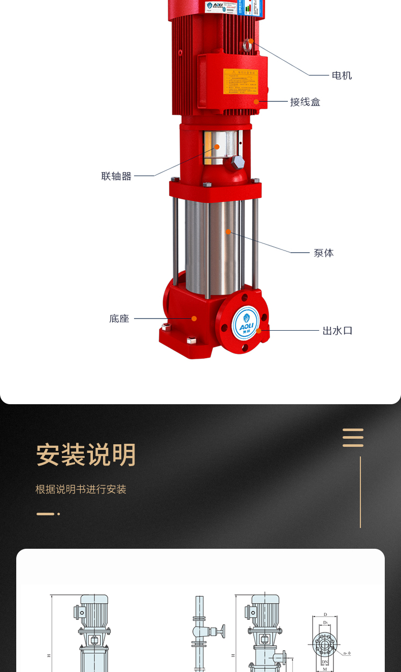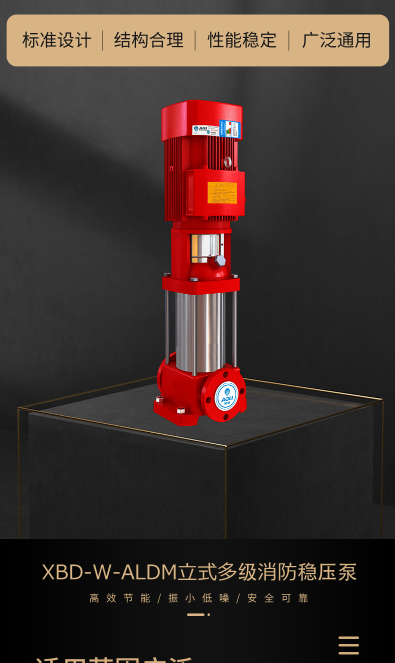 XBD-ALDM立式多級(jí)消防穩(wěn)壓泵,是在原有的ALDM立式多級(jí)泵的基礎(chǔ)上根據(jù)GB6245《消防泵》國(guó)家強(qiáng)制性標(biāo)準(zhǔn)要求進(jìn)行開(kāi)發(fā)出的新一代中低壓消防穩(wěn)壓泵組產(chǎn)品。XBD-ALDM多級(jí)消防穩(wěn)壓泵在性能、結(jié)構(gòu)、材料和配套上均滿足GB6245 《消防泵》國(guó)家強(qiáng)制性標(biāo)準(zhǔn)的要求。由于采用優(yōu)秀的水力模型,因此該系列泵具有滿足用戶要求;采用立式泵結(jié)構(gòu),具有效率高、性能范圍廣的特點(diǎn),可更好的節(jié)省占地面積的優(yōu)點(diǎn);采用優(yōu)質(zhì)軸承和優(yōu)質(zhì)電機(jī),使泵運(yùn)行更為安全可靠、噪音低、振動(dòng)小;采用水力平衡軸向力,減少平衡鼓,可使運(yùn)行更為平穩(wěn)。其
