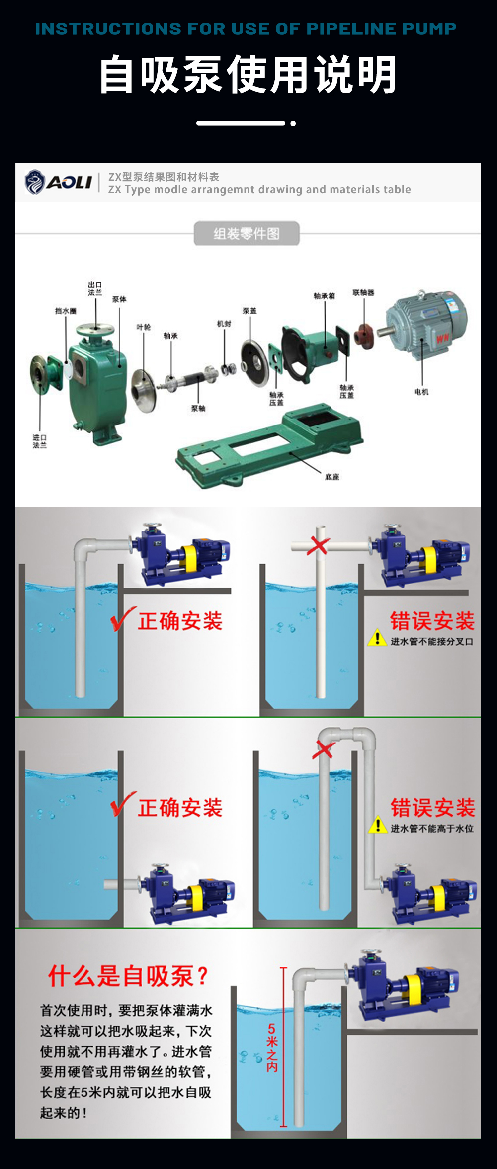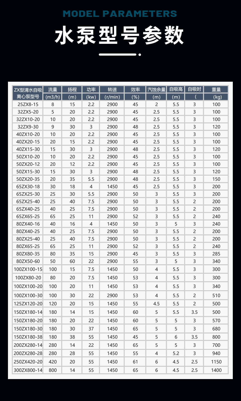 ZX系列型泵是臥式自吸泵。該型式泵 與其它型式的自吸離心泵比較,因?yàn)楸帽旧頉] 有逆止閥,結(jié)構(gòu)最為簡單;工作最為可靠;無 故障工作時(shí)間長,維護(hù)、使用方便、體積小、 重量輕、效率高、在設(shè)計(jì)上做了特別的考慮與 相同口徑的泵比較,排量大、性能高。在工農(nóng)業(yè)生產(chǎn)、搶險(xiǎn)救助,如排澇、救火中作為應(yīng)急泵使用效能更為突出。 廣泛適用石 油、化工、冶金、機(jī)械、化纖、食品、能源、交通等工業(yè)部門城市給水、亦可用于農(nóng)業(yè)排灌、 噴灌。供輸送清水或粘度小于5°E,溫度低于80℃物理及化學(xué)性質(zhì)類似清水的其它液體。